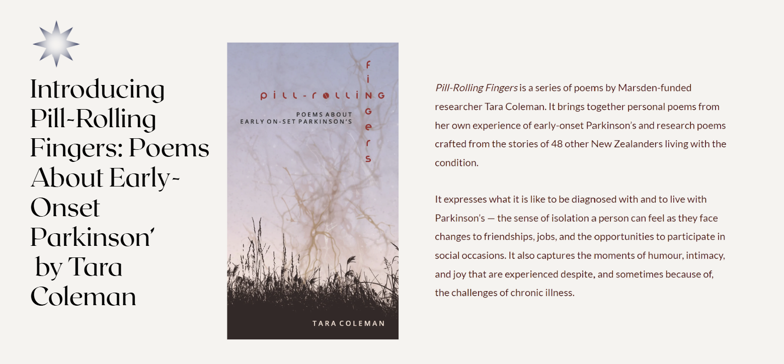 PILL-ROLLING FINGERS: Poems about early-onset Parkinson’s by Tara Coleman Available for purchase HERE